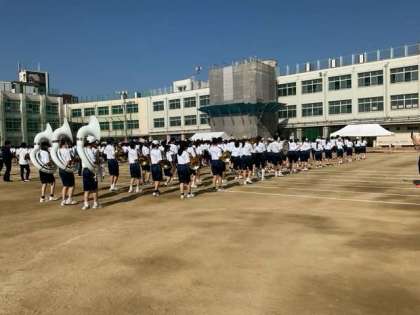 入場行進の練習です。 吹奏楽部のマーチングも凄い迫力です。