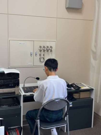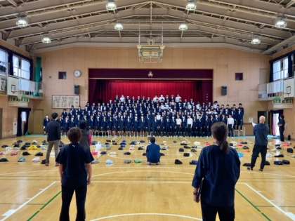 全校集会を予定していましたが、雨天のため放送集会に変更して実施しました。校長からは「時間」について講話をし、生活指導の先生からは防寒着についてのお話がありました。三年生は、全体合唱の立ち位置の確認や揃っての練習を行いました。