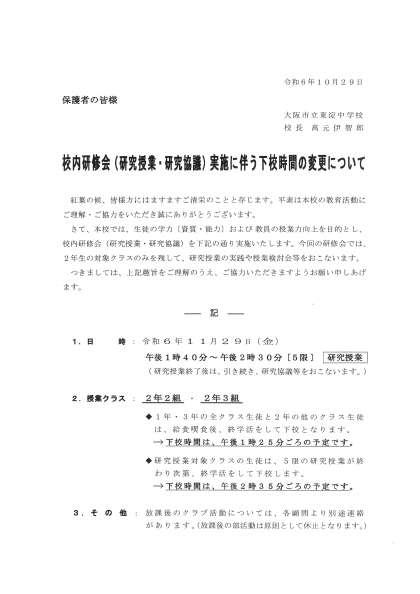 2年生の2組と3組は研究授業のため14時35分頃に下校します。