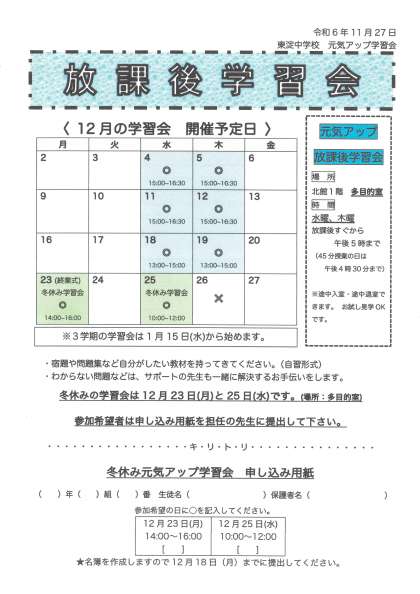 放課後学習会の12月開催予定のお知らせ