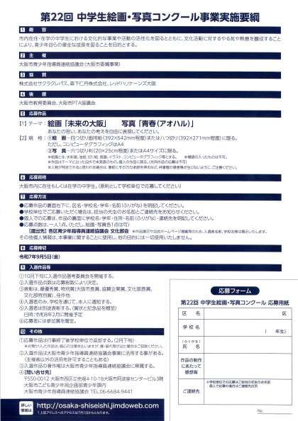 チラシ(紙面)は生徒に配布しています。 ☞ 第22回中学生絵画、写真コンクールについて