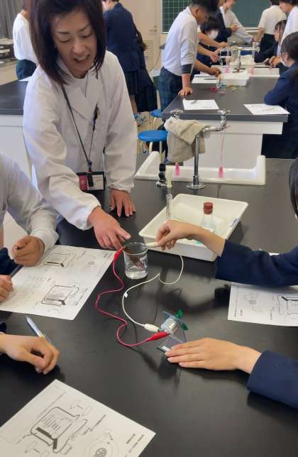 ?市内の高校から化学の先生、お二人に来ていただき、電池のしくみ、イオン、原子などについて、実験も行いながら、学びを深めました。明日から期末テストが始まります。頑張りましょう。