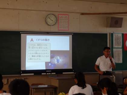 宮田憲一先生です。 昨日は生徒専門委員会の保健委員会で「くすりの正しい使い方」を講義していただき、今日はプールの水質点検に来校いただきました。暑くなる中ありがとうございました。