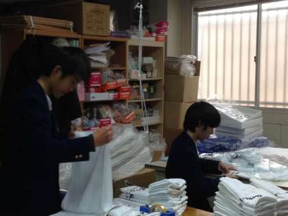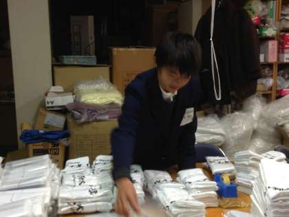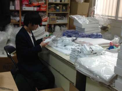 年末年始の挨拶まわりで配布するタオルの袋詰め作業です。