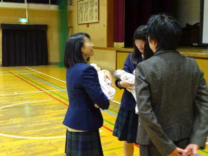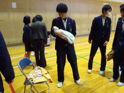 講話だけでなく、妊婦体験や赤ちゃんをだっこする体験などもおこないました。