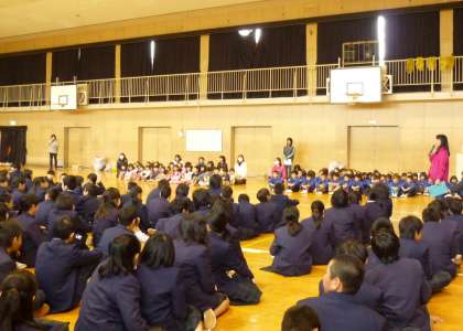 それぞれの園から元気な声で歌を発表してもらい、中学生からは文化祭で取り組んだ大きな紙芝居の読み聞かせをしました。