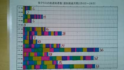 2月6日〜28日までの期間、予鈴遅刻者数が一番少なかったクラスは1年5組で0人でした。
