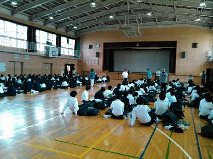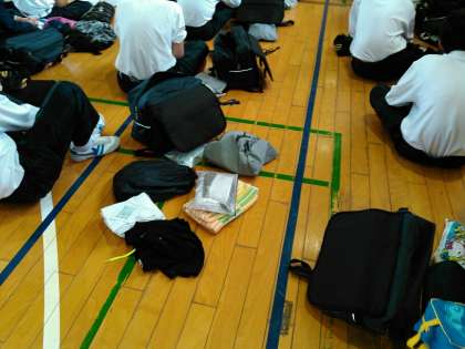本日5時間目に1年生が一泊移住の事前指導を行いました。写真は持ち物の確認をしている様子です。今日、忘れていた物や用意ができていないもの、当日に準備するものなどあらためて確認しておいてください。ご家庭でもご指導、ご協力をお願いいたします。