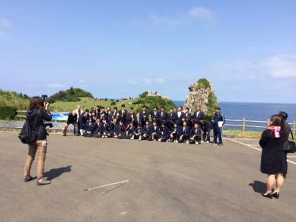 3組が猿岩で学級写真を撮影しています。