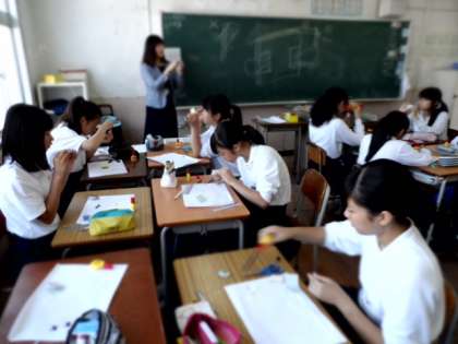 写真は好文女子高等学校の豆本作りの授業の様子です。