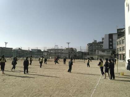 女子はサッカー、男子はキックベースをクラス対抗で行っています。応援で盛り上がるだけでなく、審判など係の仕事もしています。どのクラスも優勝目指して頑張れ!