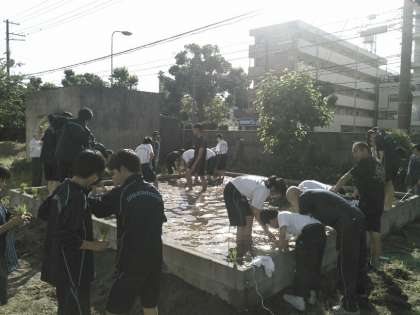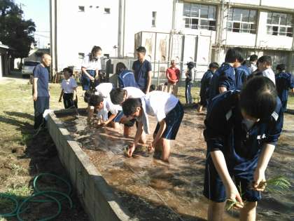 今年も生徒会執行部、特別支援学級の生徒とともに田植えを行いました。