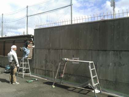 6月に発生した大阪北部を震源とする地震で被害を受けた外壁の補修工事が行われています。職人の方がひび割れている外壁の各所に目印をつけて、そこに薬品を注入して補強する作業をされていました。崩れた壁の一部の修理もしていただきました。