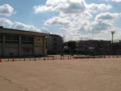本日より給食棟の建設工事が始まりました。写真は作業や建設資材を置くための場所を確保するために仮囲いを行っているところです。