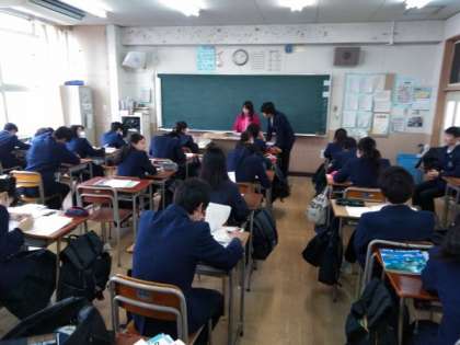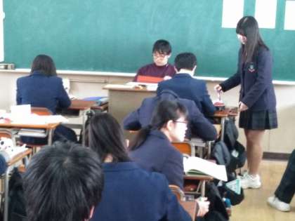 来週の学年末テストの勉強をする生徒、希望する高校の過去の試験問題に向かう生徒、進路に向けての書類について担任からアドバイスを受けている生徒。