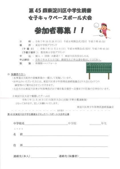 書面 ☞ 第45回 東淀川区中学生親善女子キックベースボール大会の案内