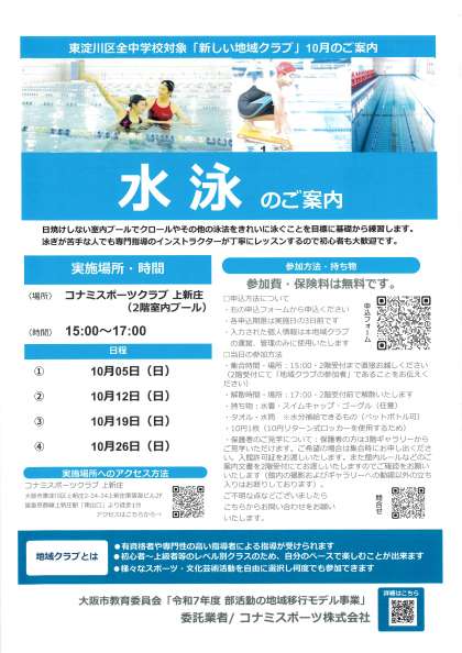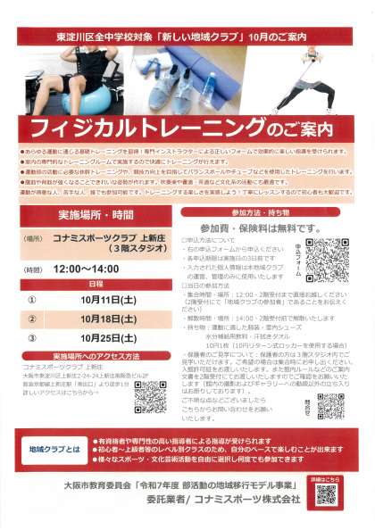 東淀川区全中学校対象「新しい地域クラブ」の10月案内です。