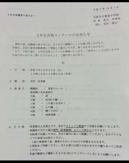 次は、合唱コンクール(10/23)や文化発表会(10/31)の場で、