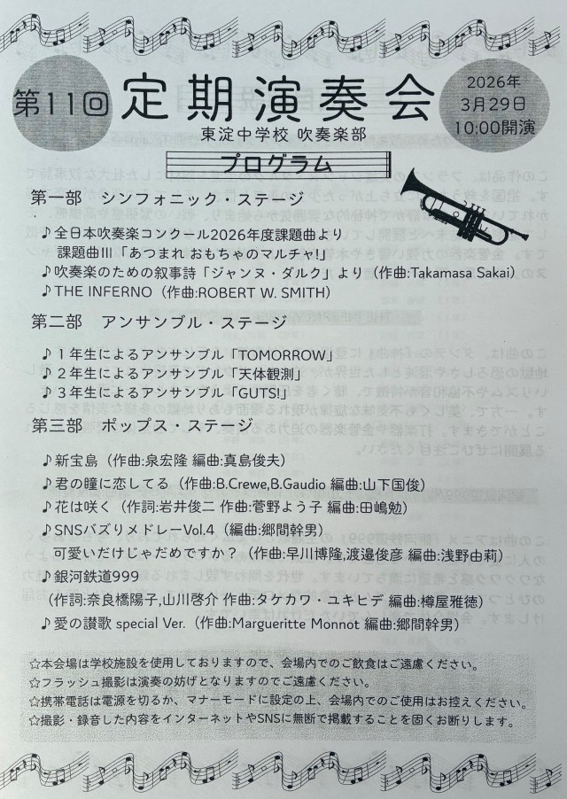 3月29日(日)午前10時より、本校吹奏楽部による「第11回定期演奏会」が体育館で開演され、先日卒業した3年生も一緒に参加し、すばらしい演奏をしてくれました。