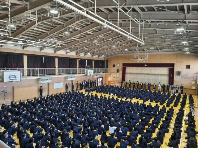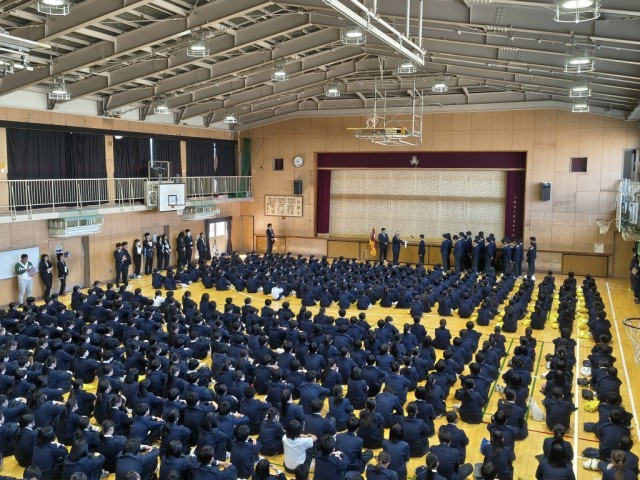 クラス発表のあと、体育館において着任式、始業式、部活動表彰(野球部)を