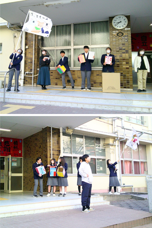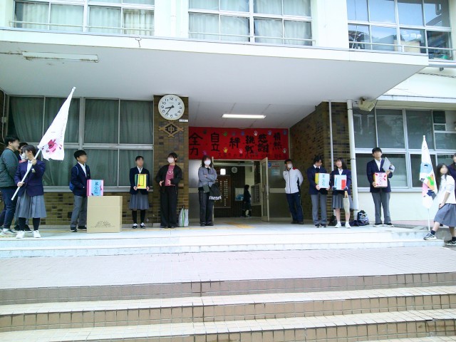 本日は、インフルエンザウイルス等の感染症拡大防止のため、1月29日(木)と1月30日(金)に中止となってしまった『グッとモーニングキャンペーン』の追加実施日でした。追加日の本日は、本校正門前で、朝のあいさつ運動を行いながら、書き損じはがきの回収や『服のチカラプロジェクト』の子ども服の回収、赤い羽根募金などを実施しました。
