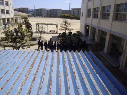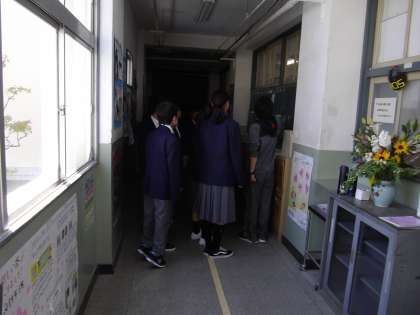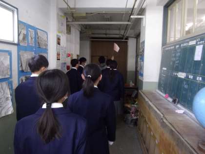 徹夜で作った?旗を持ったガイドさんの案内で校内を巡ります。