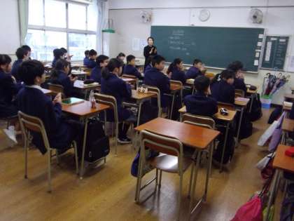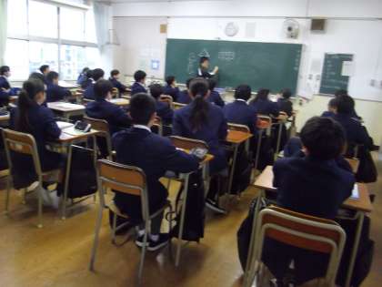 1年3組は数学です。黒板のバスの絵を見て進行方向を考えています。