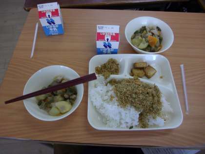 今日のメニューは「ご飯・牛乳・鶏肉とじゃがいもの煮もの・厚揚げの醤油だれかけ・紅鮭そぼろ」の5品です。