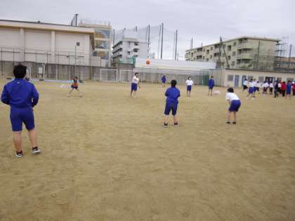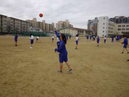 体力テスト「ボール投げ」の測定前の肩慣らしです。