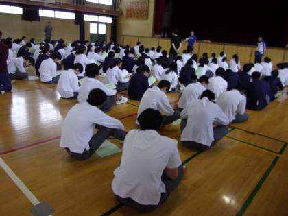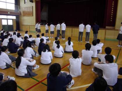 修学旅行1日目の平和学習時に行うセレモニーの練習・リハーサルです。