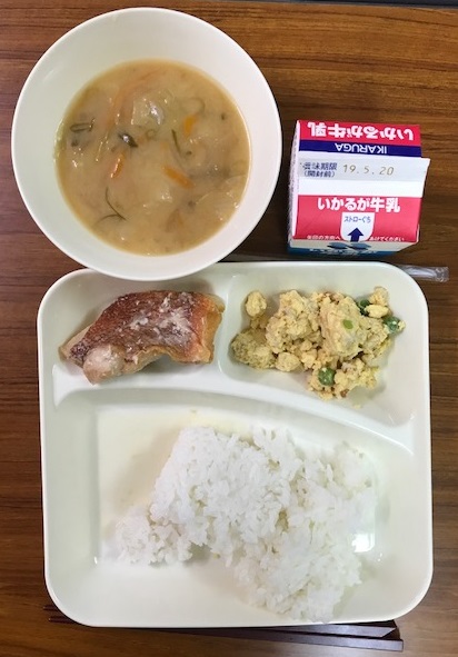 今日のメニューは「ごはん・牛乳・赤魚の醤油だれかけ・えんどうの卵とじ・味噌汁」の5品です。