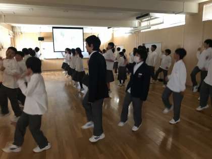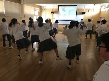 プロジェクターで見本の動画を大写しして一緒に振りを覚えていきます。