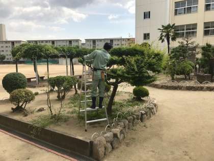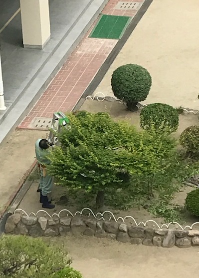 暑い中、外で管理作業員さんが樹木の剪定(せんてい)をしています。
