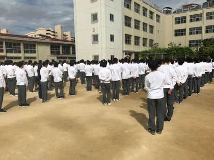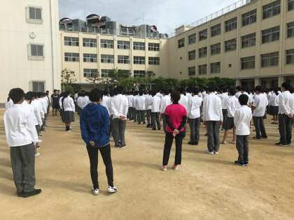 天気予報は雨でしたが、いいお天気のもと、全校集会をしました。