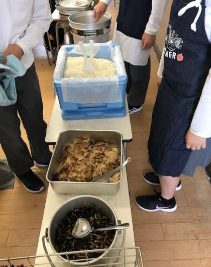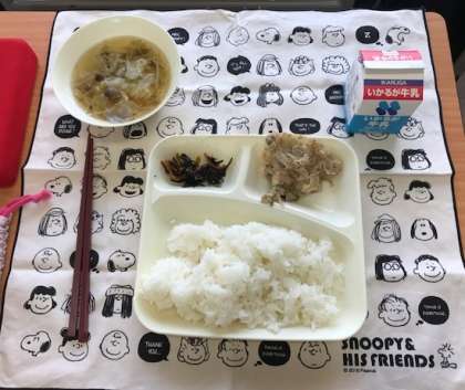 さて、今日の給食メニューは「ごはん・牛乳・豚肉のごまだれ焼き・五目汁・ひじきの炒め煮」の5品です。