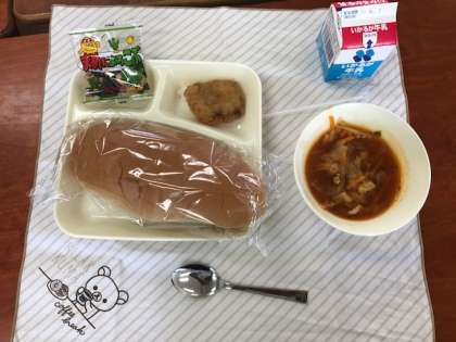 今日のメニューですが、「黒糖パン・牛乳・一口トンカツ・ミネストロー・豆こんぶ」の5品です。