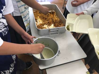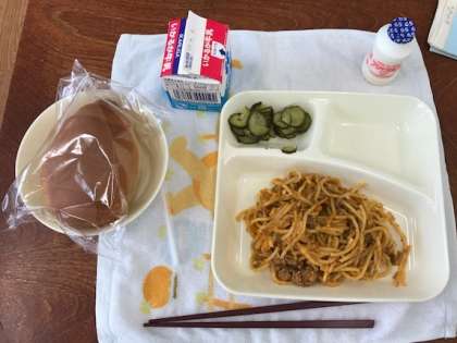 今日のメニューは「きゅうりのバジル風味・黒糖パン・牛乳・スパゲッティミートソース・発酵乳」の5品です。