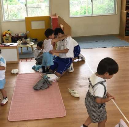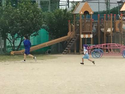 写真上:お外遊び。「追いかけっこ」です。逃げろーッ!!!