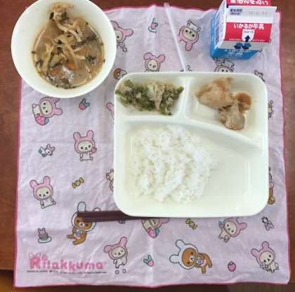今日のメニューは「ごはん・牛乳・鶏肉のおろし醤油かけ・味噌汁・野菜炒め」の5品です。