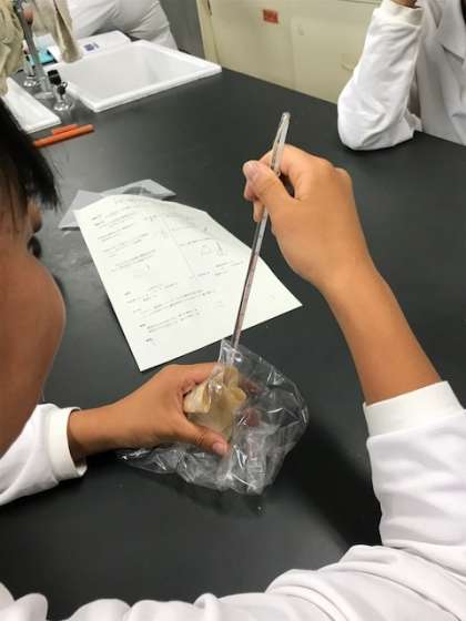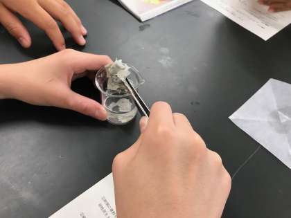 写真中:「塩化ナトリウム」を袋の中の化学物質にかけます。