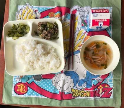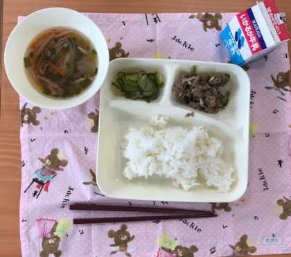 今日のメニューは、「ご飯・チンジャオニューロース—・ハムと野菜の中華スープ・胡瓜の辛味漬け・牛乳」の5品です。