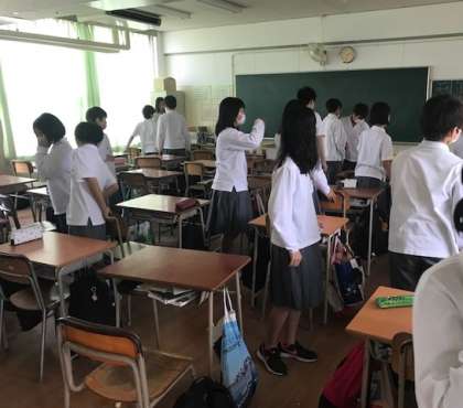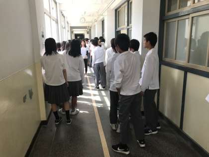 「1年生は東階段、2年生も東階段、3年生は南階段を使ってグラウンドの避難場所へ落ち着いて避難してください。その際、校舎内は歩いて移動、校舎から出たら走るようにしてください。」