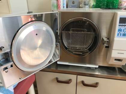 中のカゴに歯鏡を入れて滅菌消毒します。