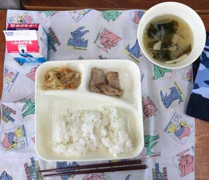 今日のメニューは「鶏肉の醤油バター焼き・五目汁・切り干し大根の炒め煮・ごはん・牛乳」の5品です。