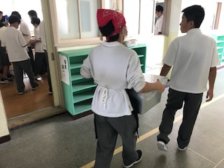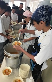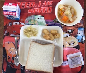 今日のメニューは「烏賊天婦羅・サワーソテー・フレッシュトマトのスープ煮・食パン(林檎ジャムを添えて・牛乳」の5品です。