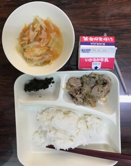 今日のメニューは「豚肉の胡麻味噌焼き・海苔の佃煮・すまし汁・ごはん・牛乳」の5品です。