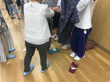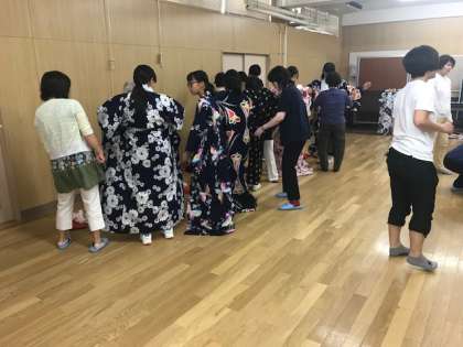本日、2・3時間目に1年3組の生徒が、日本文化体験として、浴衣を着て、盆踊りを踊りました。浴衣は地域の方たちからの昨年度からの寄付です。着付けにも約15名の地域の方にご協力をしていただきました。ありがとうございました。