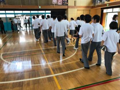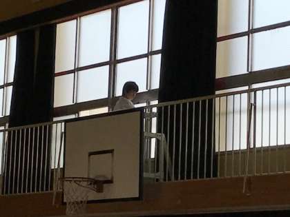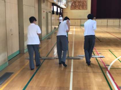 集会後、生徒会役員が窓閉めとフロアのモップかけをしてくれています。