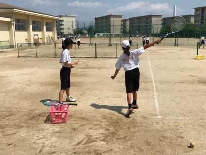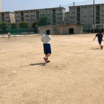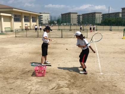 昨日の雨と今日の暑さで運動場が非常にもわっとしていますが、女子ソフトテニス部が元気に活動しています。