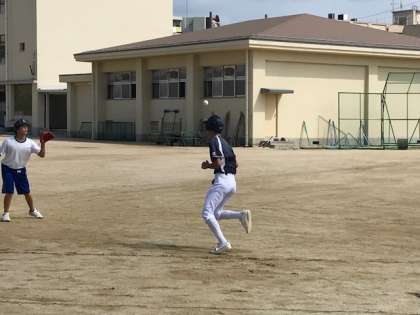 写真下:ランナーが2塁に向かったところ、再びセカンドに送球、タッチアウトで挟殺プレーの完成です。